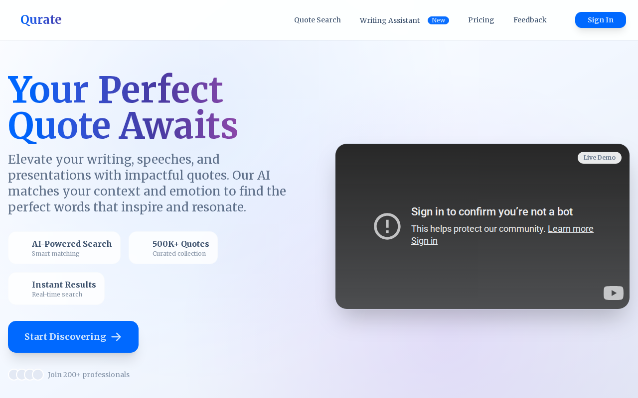 Qurate is an AI-driven quote search engine and writing assistant designed to help users find and integrate impactful quotes into their content. It leverages a vast database of over 500,000 curated quotes and employs AI to match quotes to specific contexts, emotions, and writing styles. Unlike generic quote search tools, Qurate offers real-time quote suggestions as you write, enhancing the creative process. This platform is ideal for writers, marketers, presenters, and anyone seeking to elevate their communication with the perfect words. The AI analyzes content to suggest relevant quotes, making it a valuable tool for crafting compelling narratives and presentations.