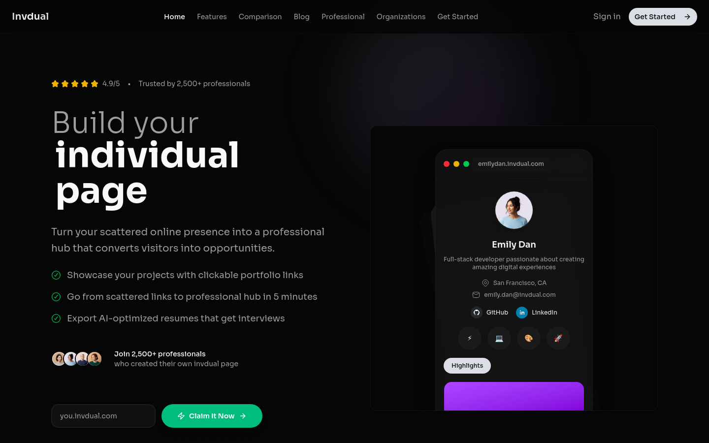 Invdual solves the common problem of a fragmented online presence by consolidating your professional identity into a single, high-impact hub. Instead of managing scattered links across various platforms, you can centralize your portfolio, social profiles, and career highlights in one clean, mobile-optimized space. This platform is designed for professionals who need to convert casual visitors into tangible opportunities, whether that means landing a new role or attracting high-value clients. Beyond simple profile hosting, the platform integrates an AI-powered resume builder that generates ATS-optimized documents, ensuring your applications actually reach human recruiters rather than getting lost in automated filters. You can also establish yourself as an industry authority by publishing blog posts and case studies directly on your profile. With built-in smart analytics, you gain actionable data on how your content performs, allowing you to refine your personal brand and track engagement over time. It is a comprehensive toolkit for anyone looking to bridge the gap between their raw experience and their professional reputation.