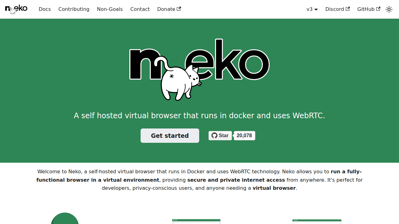 Neko is a self-hosted virtual browser that runs in Docker and utilizes WebRTC. It offers a secure and private browsing experience by running a fully functional browser within a virtual environment. Users can access and control the browser remotely, making it ideal for various applications. Neko provides a flexible and isolated browsing solution, enhancing privacy and control over online activities. It's designed for users who need a secure, remote, and easily manageable browsing environment, offering a robust solution for accessing web content.
