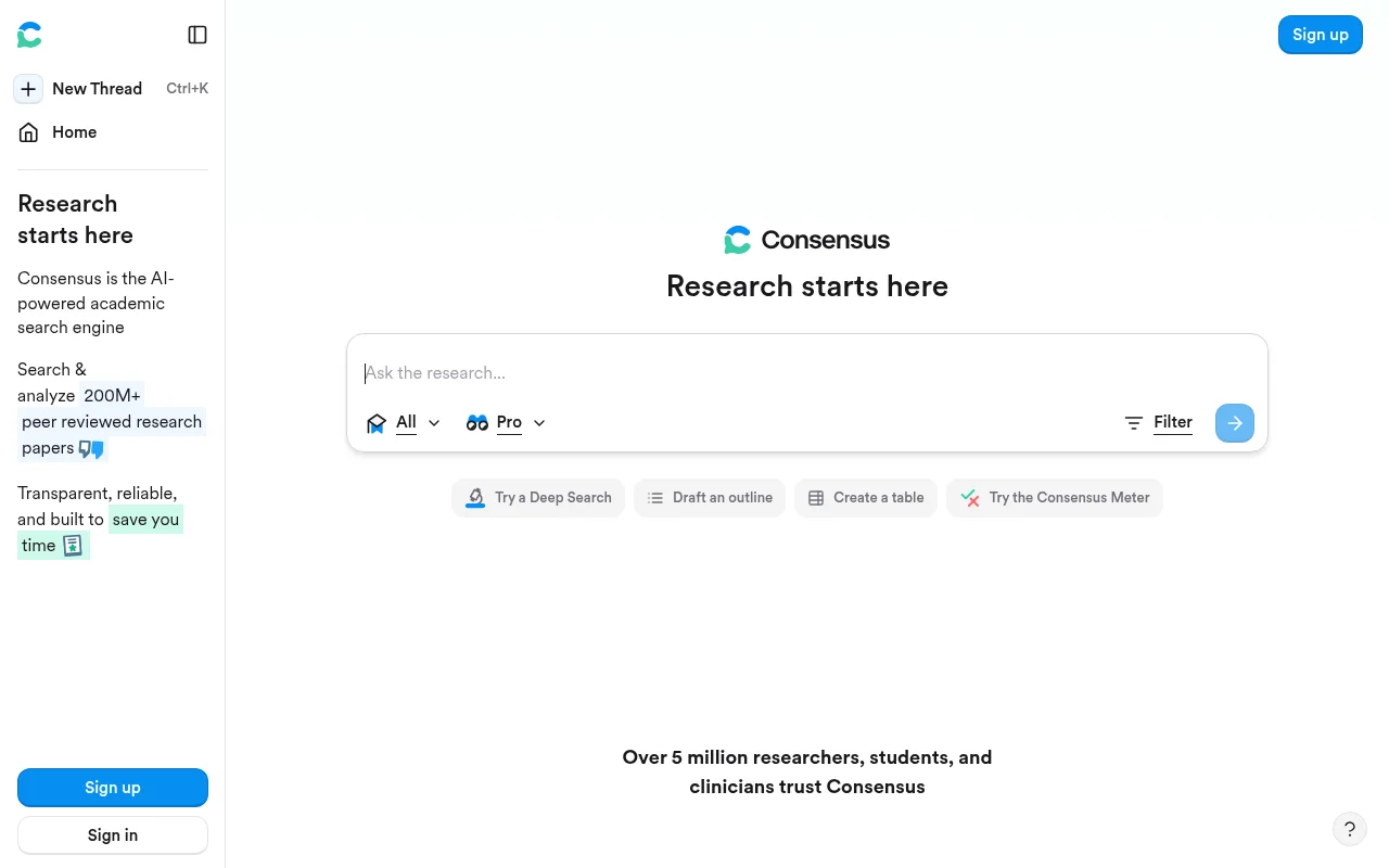 Consensus is an AI-powered search engine designed to accelerate research by providing evidence-based summaries of scientific papers. It leverages natural language processing (NLP) to analyze millions of research papers and extract key findings, synthesizing them into concise, easy-to-understand summaries. Unlike traditional search engines that simply list papers, Consensus directly answers research questions with supporting evidence. This tool is unique because it focuses on extracting and summarizing information from scientific literature, saving researchers time and effort. It uses advanced NLP models to identify and extract key claims, methodologies, and results. Researchers, academics, and anyone needing to quickly understand scientific research benefit most from Consensus.
