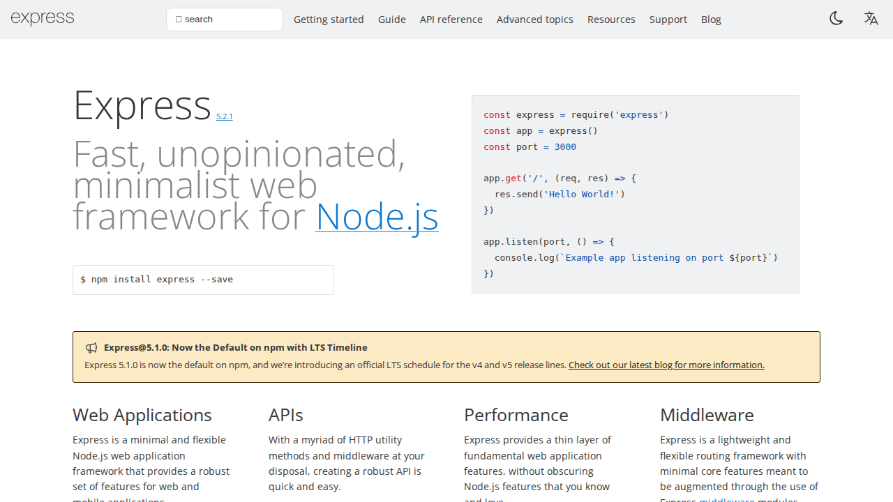 Express is a fast, unopinionated, and minimalist web application framework for Node.js. It provides a robust set of features for building web and mobile applications, offering a thin layer of fundamental features without obscuring Node.js's native capabilities. Its core value lies in its flexibility and speed, enabling developers to quickly create APIs and web applications with minimal overhead. Unlike full-fledged frameworks, Express allows developers to choose their own middleware, providing granular control over the application's functionality. This approach, combined with its lightweight design, makes Express ideal for projects requiring performance and customization. Developers building APIs, single-page applications, and real-time applications benefit most from Express's streamlined approach.