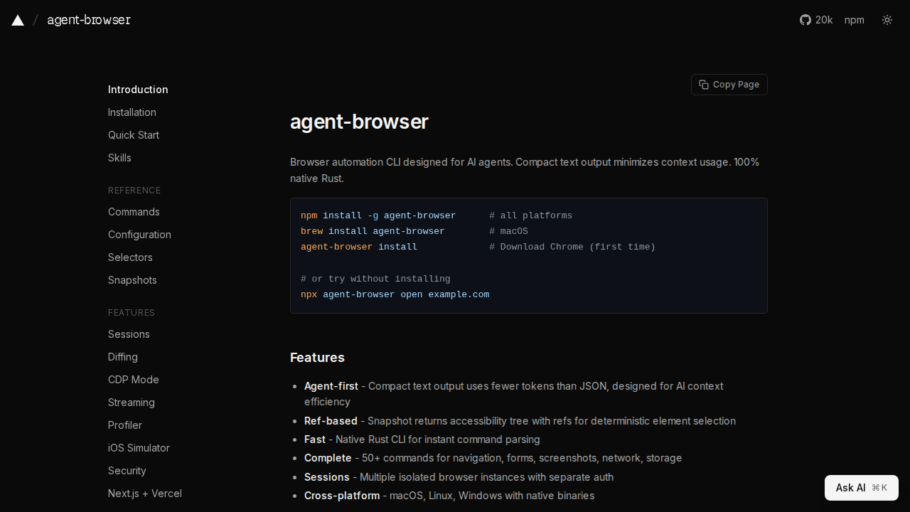 agent-browser is a CLI tool for headless browser automation, specifically designed for AI agents. Built with native Rust, it offers fast and efficient command parsing and execution. The tool focuses on compact text output to minimize token usage, making it ideal for AI context efficiency. It provides a comprehensive set of over 50 commands for navigation, form interaction, screenshots, network control, and storage management. Features include sessions for isolated browser instances, cross-platform support (macOS, Linux, Windows), and compatibility with various AI agents like Claude Code, Cursor, and OpenAI Codex. The tool's ref-based snapshot feature provides a deterministic element selection using accessibility trees.