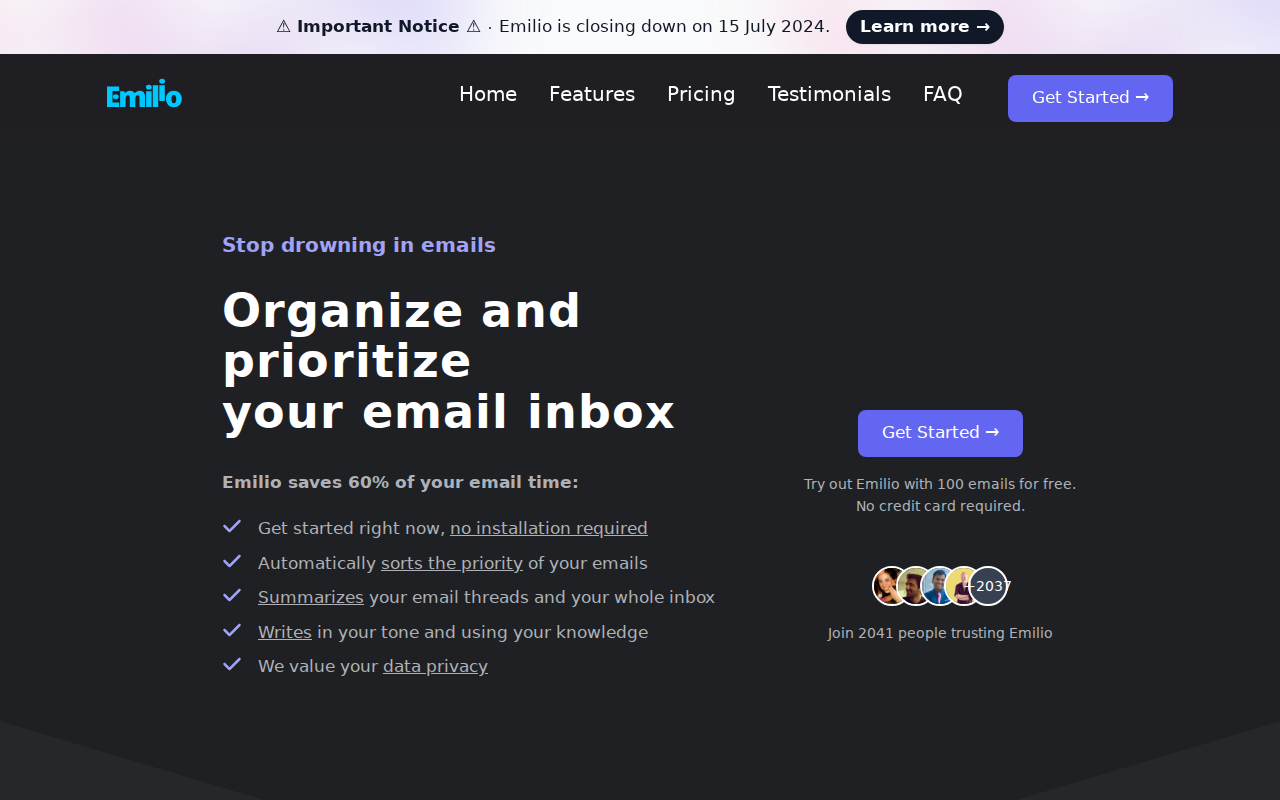 Emilio is an AI-powered email assistant designed to streamline your inbox. It automatically sorts, summarizes, and helps you respond to emails, saving you time and reducing inbox clutter. Unlike basic email filters, Emilio leverages AI to understand the context and intent of your emails, offering smart suggestions and automating repetitive tasks. The core technology uses natural language processing (NLP) and machine learning (ML) models trained on vast datasets of email interactions. This allows Emilio to learn your preferences and provide increasingly accurate and personalized assistance. Emilio is ideal for busy professionals, entrepreneurs, and anyone overwhelmed by email volume, enabling them to manage their inbox more efficiently and focus on high-priority tasks.
