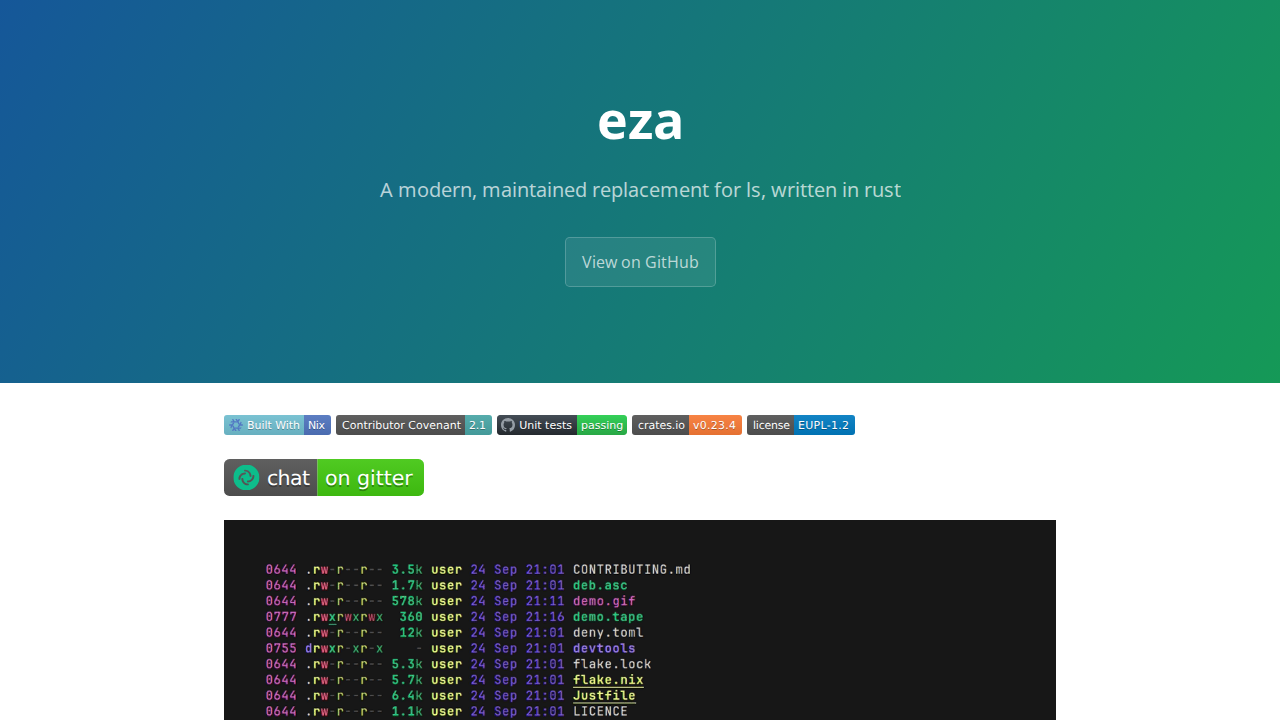 eza is a modern, feature-rich replacement for the 'ls' command, written in Rust. It enhances file listing with colors, Git integration, and improved defaults. eza addresses shortcomings found in its predecessor, exa, including bug fixes, hyperlink support, mount point details, and security enhancements. It offers human-readable relative dates and supports bright terminal colors. eza is designed to be fast, user-friendly, and provides a single binary for easy installation across various operating systems. It's ideal for users seeking a more informative and visually appealing way to navigate and manage files in the command line.