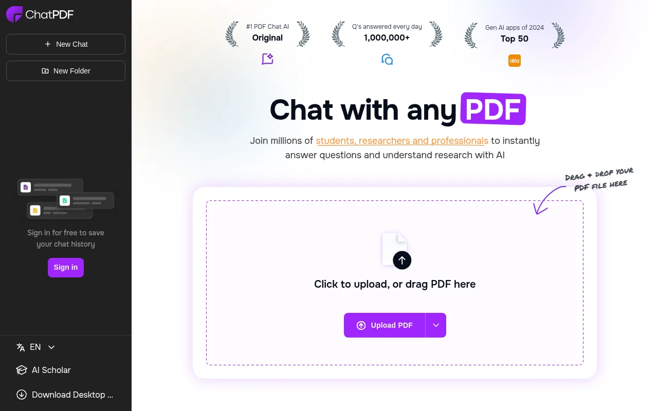 ChatPDF allows users to interact with PDF documents using natural language. It leverages AI to understand the content of a PDF and answer questions, summarize information, and provide insights. Unlike traditional PDF readers, ChatPDF enables users to quickly extract key information without manually reading the entire document. The tool uses advanced natural language processing (NLP) and machine learning models to analyze the text and provide accurate and relevant responses. This is particularly useful for researchers, students, and professionals who need to quickly grasp the content of lengthy documents. It differentiates itself by offering a conversational interface, making document analysis more intuitive and efficient.