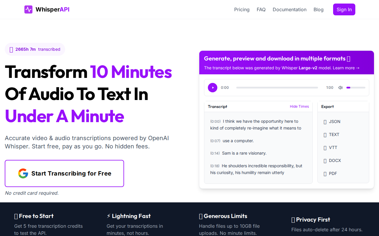 WhisperAPI is optimized for speed, allowing for rapid transcription of audio and video files. It can transcribe 10 minutes of audio in under a minute, depending on the file size and server load. This speed is achieved through efficient processing and optimized infrastructure, making it suitable for real-time or near-real-time transcription needs. The API is designed to handle high volumes of requests efficiently.