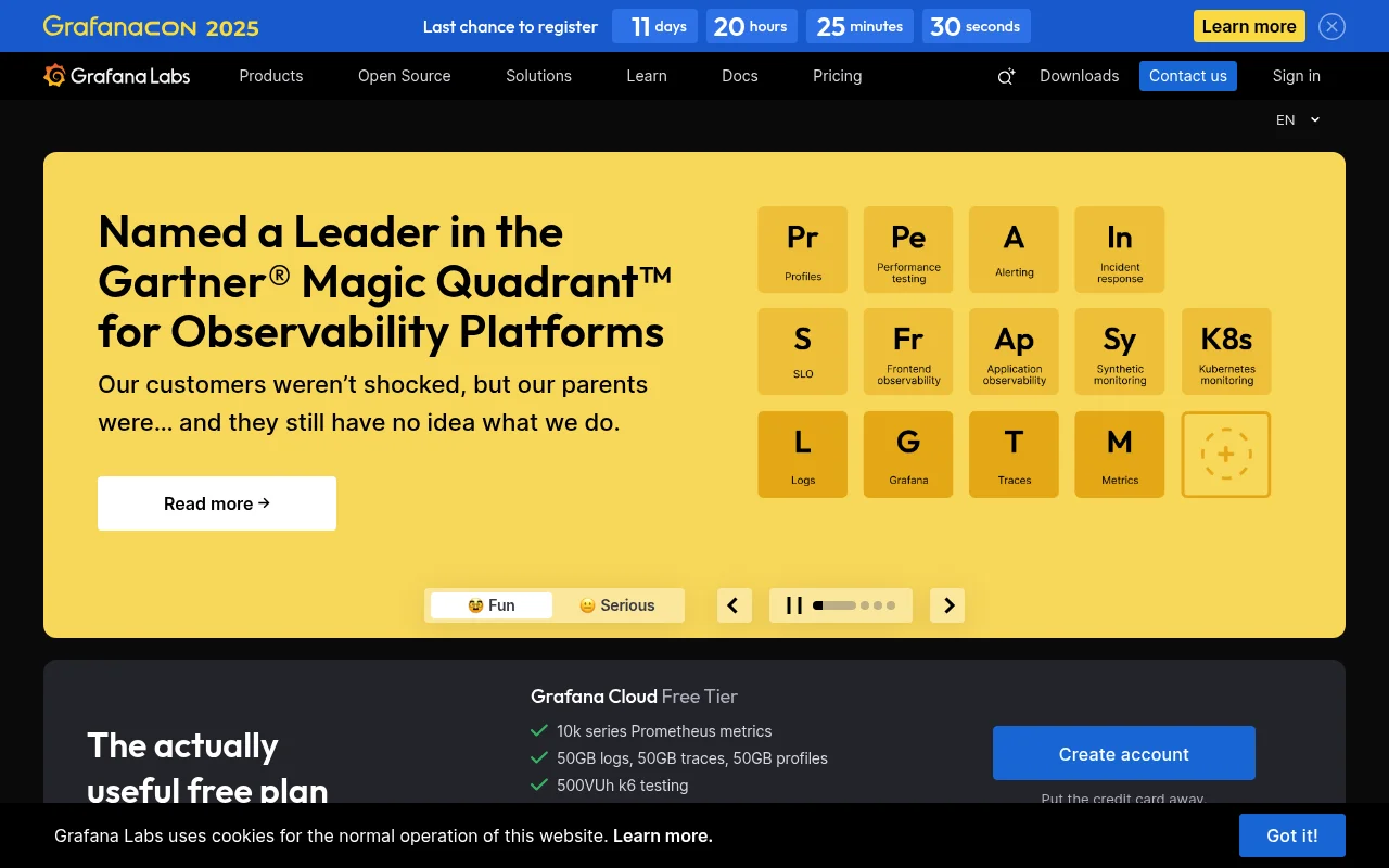 Open Source (AGPLv3). Cloud-hosted options available with varying features and pricing tiers, including a free tier for basic usage and paid plans for increased storage and features. Pricing details are available on the Grafana Cloud website.