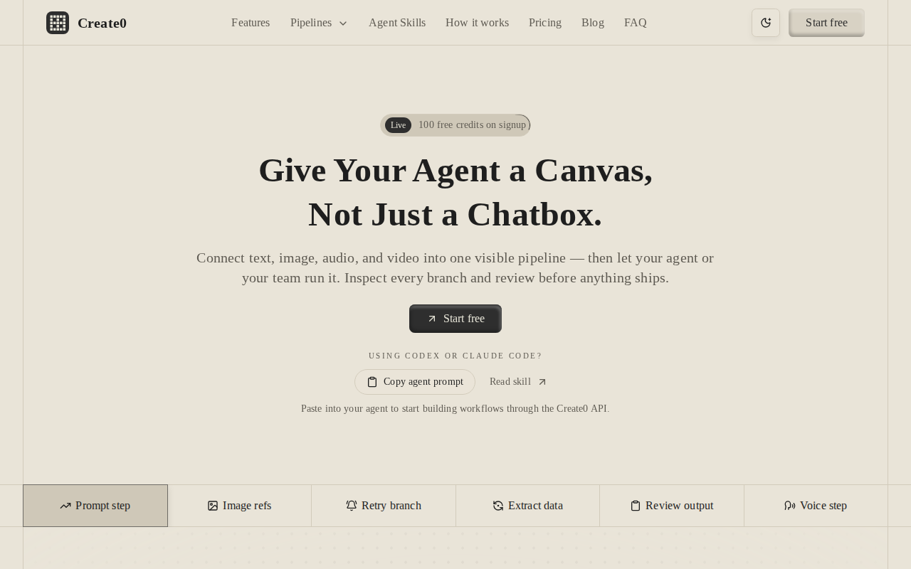 Create0 provides a visual canvas for building and managing AI agent pipelines. It allows users to connect text, image, audio, and video inputs and outputs into a single, inspectable workflow. Unlike traditional chat-based agent interactions, Create0 offers a transparent view of the entire process, enabling teams to review, refine, and debug agent behavior. The platform uses a node-and-edge system to map pipelines, supporting branching and iterative refinement. This approach enhances collaboration and trust in AI-driven processes, making it ideal for teams seeking to operationalize AI agents for tasks like content generation, data extraction, and automated workflows. Create0's focus on visual clarity and control differentiates it from chat-based interfaces and code-heavy agent frameworks.
