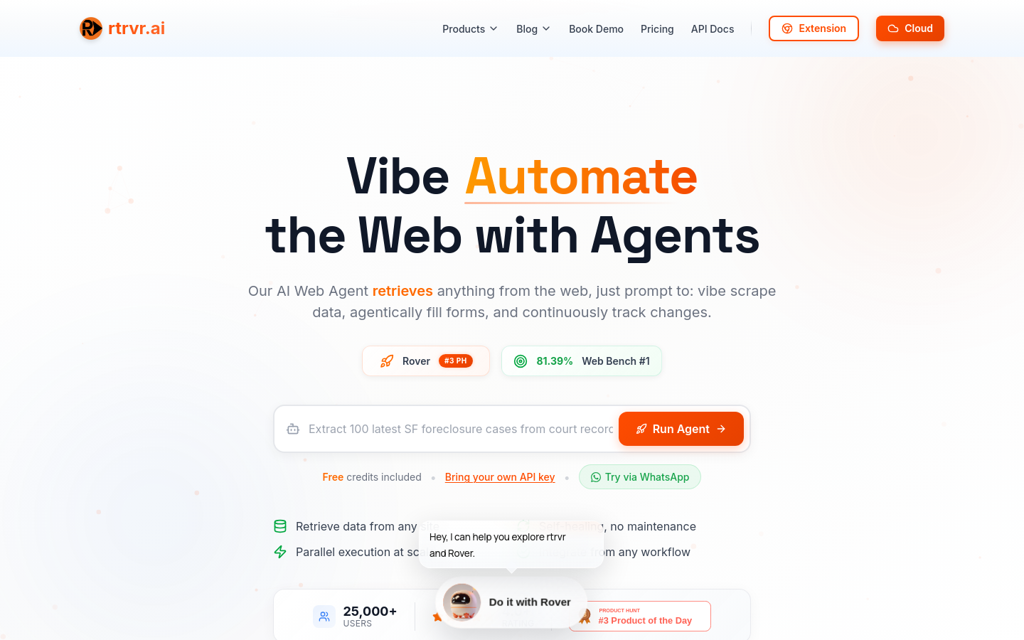 rtrvr.ai is an AI-driven web automation and data extraction platform designed to eliminate the manual friction of repetitive browser tasks. By utilizing DOM-native processing rather than traditional vision-based models, the platform delivers a faster, more cost-effective way to handle complex web research, form filling, and site monitoring. It is built for developers, data analysts, and growth hackers who need to scale operations without the maintenance overhead typically associated with brittle automation scripts. The platform stands out by operating without the Chrome DevTools Protocol, allowing agents to remain invisible to anti-bot systems while executing secure, login-protected tasks. Whether you are running a single background task via a Chrome extension or orchestrating 1,000+ cloud browser agents simultaneously, rtrvr.ai provides the infrastructure to handle massive data extraction and multi-site monitoring. With self-healing capabilities that adapt to website changes automatically, it ensures your workflows remain operational with minimal intervention. Users can trigger these agents through a WhatsApp bot, direct API calls, or by integrating with existing stacks like n8n, making it a versatile tool for automating everything from job applications to real-time reporting.