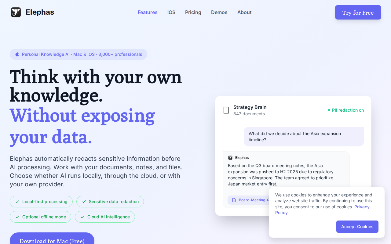 Elephas is an AI-powered writing and knowledge management tool designed for sensitive documents. It provides a private workspace where users can securely store and interact with their data. Unlike cloud-based alternatives, Elephas prioritizes privacy by offering local processing and end-to-end encryption. The core technology leverages advanced natural language processing (NLP) models to assist with writing, research, and information retrieval. Users benefit from features like AI-powered summarization, document analysis, and content generation, all while maintaining complete control over their data. This makes Elephas ideal for professionals and individuals who handle confidential information and require a secure and efficient writing environment.