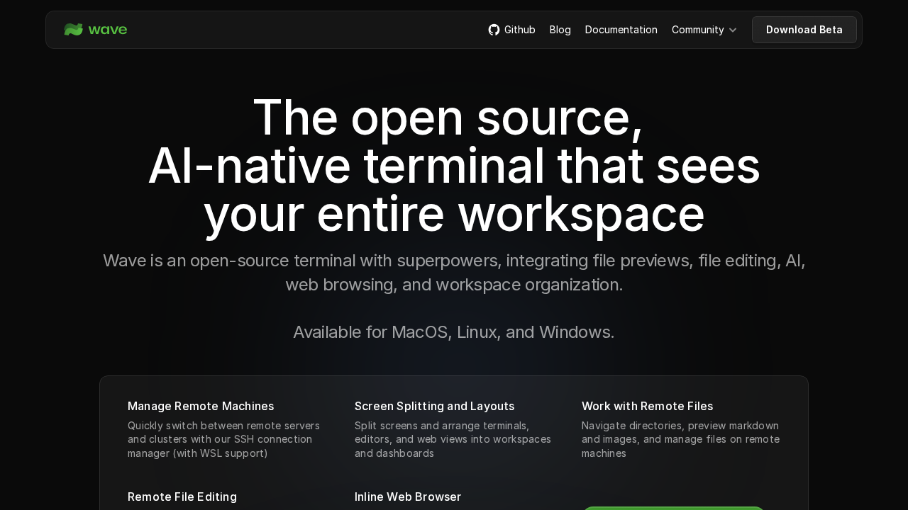 Wave Terminal enhances your command-line experience. It's designed to be a modern, feature-rich terminal, offering improvements over traditional command-line interfaces. Wave Terminal focuses on usability and efficiency, providing a streamlined workflow for developers and power users. It aims to simplify complex tasks, improve navigation, and offer a more visually appealing and intuitive interface. The tool leverages modern technologies to provide a responsive and customizable environment, making command-line interactions more productive and enjoyable. It's built to be a versatile tool for various development and system administration tasks.