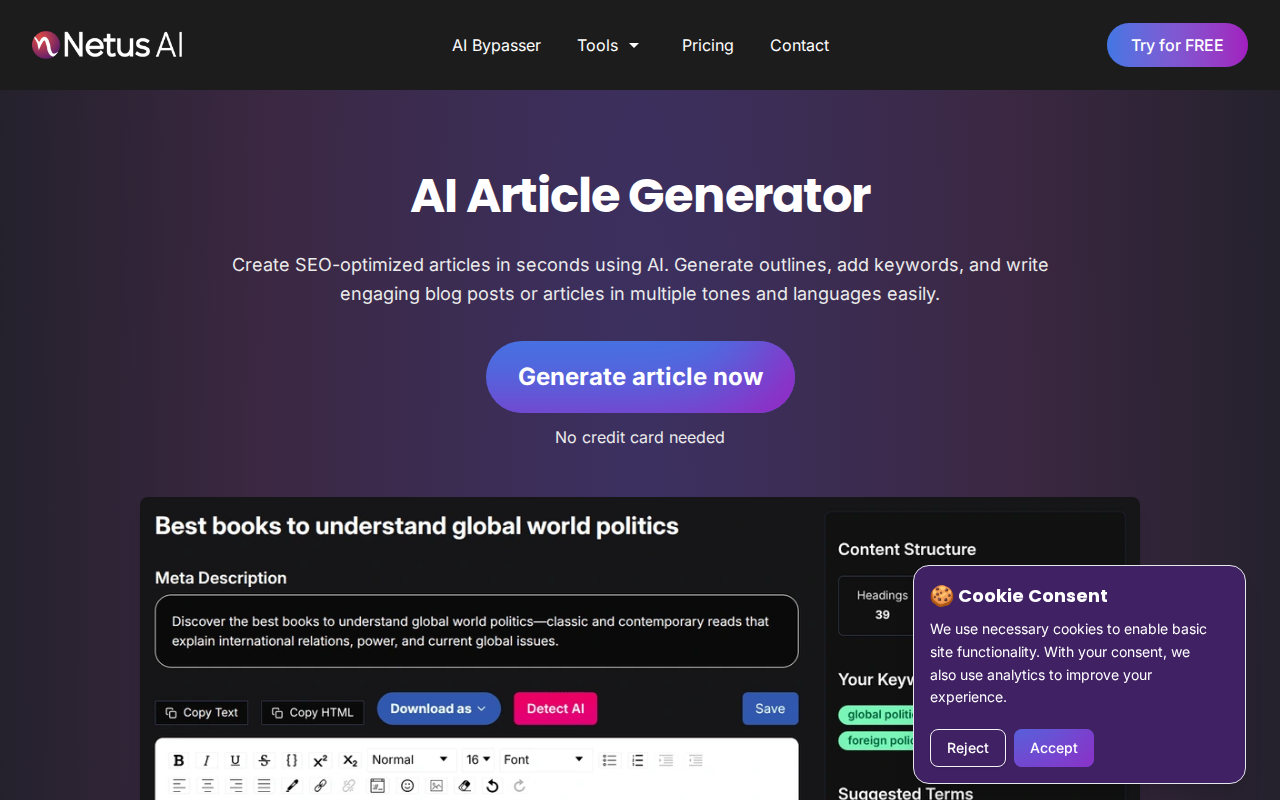 Freemium: Free plan with limited features and monthly article generation. Paid plans offer more features, higher article limits, and advanced SEO tools. Pricing details are available on the website.