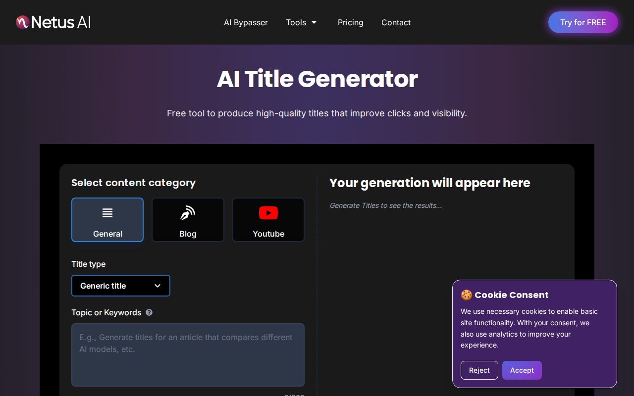 NetusAI offers its title generator as a free tool, making it accessible to a wide audience, from individual bloggers to small businesses. This eliminates the barrier to entry for users who need assistance with title creation but may not have the budget for paid tools. The free access allows users to generate an unlimited number of titles.