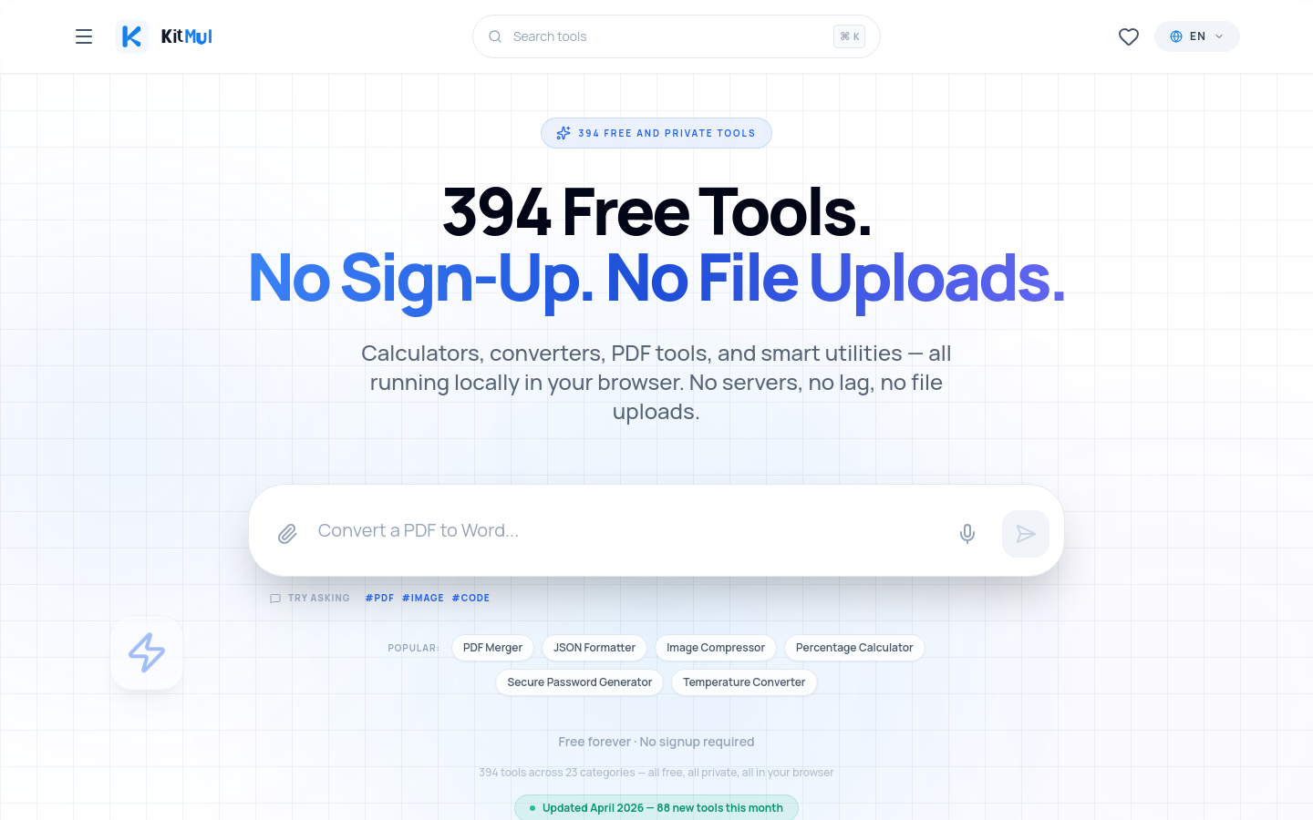 Kitmul is a comprehensive, privacy-focused suite of over 390 free digital utilities designed to run entirely within your web browser. By leveraging client-side processing, Kitmul ensures that all files, text, and data remain on your local device, eliminating the need for server uploads and ensuring maximum security for sensitive information. The platform covers 23 diverse categories, including PDF manipulation, image processing, coding utilities, financial calculators, and cryptography. Built by Aral Roca, the project prioritizes speed, accessibility, and a clean, ad-free user interface. Because the tools function as a Progressive Web App (PWA), they offer near-instant performance and can even be used offline, making them a reliable alternative to traditional, server-dependent online tool websites.