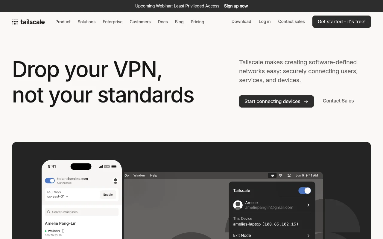 Tailscaleは、WireGuardプロトコルを基盤としたゼロトラストなIDベースのネットワーキングプラットフォームです。従来のVPN、SASE、PAMを置き換え、複雑なファイアウォール設定や踏み台サーバーを必要とせずに、リモートチーム、マルチクラウド環境、IoTデバイスを接続するピアツーピアのメッシュネットワークを構築します。トラフィックを中央ゲートウェイ経由でルーティングする従来のハブ&スポーク型VPNとは異なり、Tailscaleはノード間に直接暗号化トンネルを確立します。既存のIDプロバイダー(Okta、Google、Microsoft)と統合して詳細なアクセス制御を強制できるため、分散インフラへの安全かつ低遅延なアクセスを必要とするDevOpsエンジニア、セキュリティチーム、AI開発者に最適です。