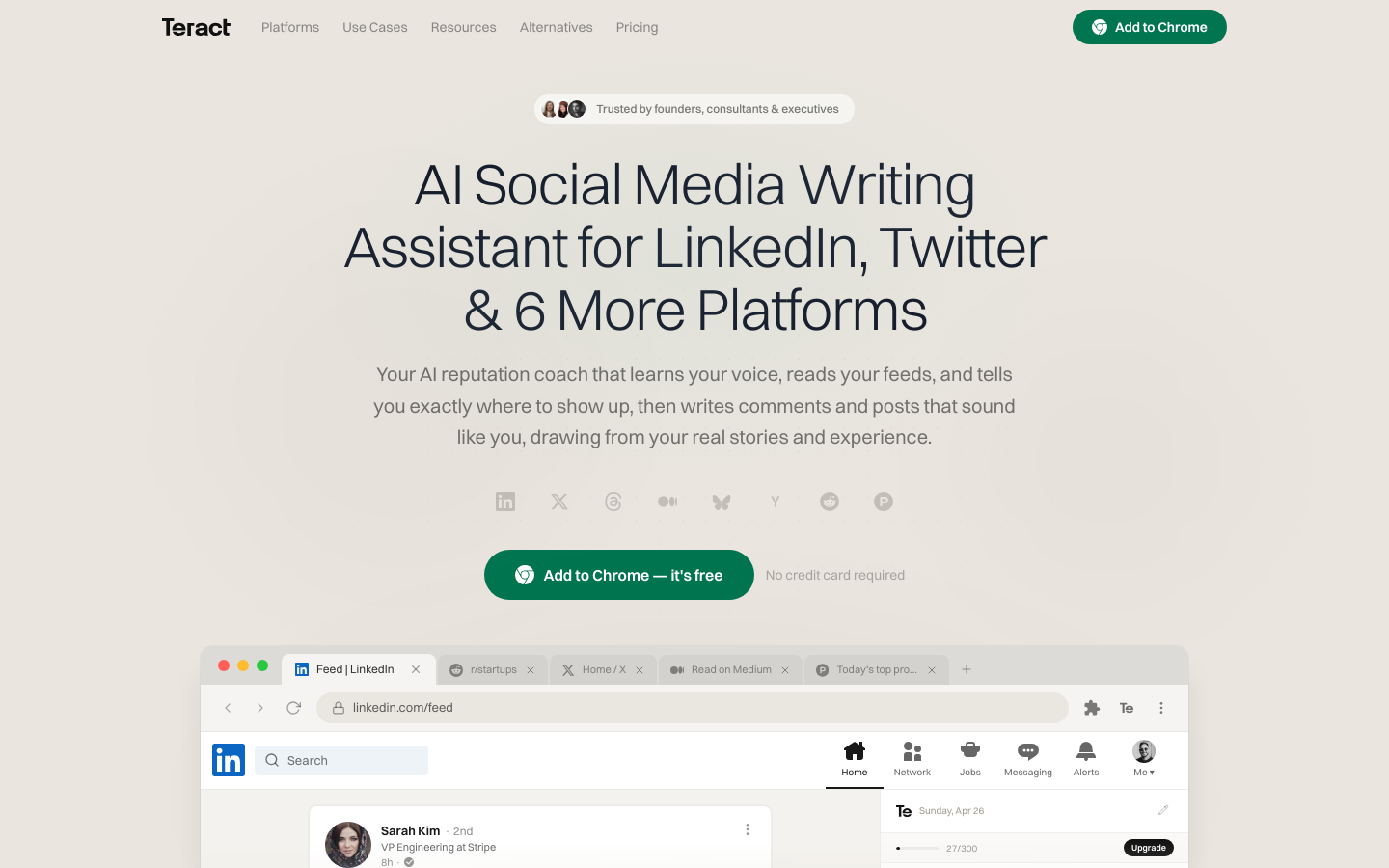 Установите расширение Chrome.,Подключите свои учетные записи в социальных сетях (LinkedIn, X и т. д.).,Разрешите Teract анализировать ваши прошлые публикации и взаимодействия.,Получайте предложения по участию в обсуждениях и контенту.,Используйте Teract для создания черновиков комментариев и постов своим голосом.