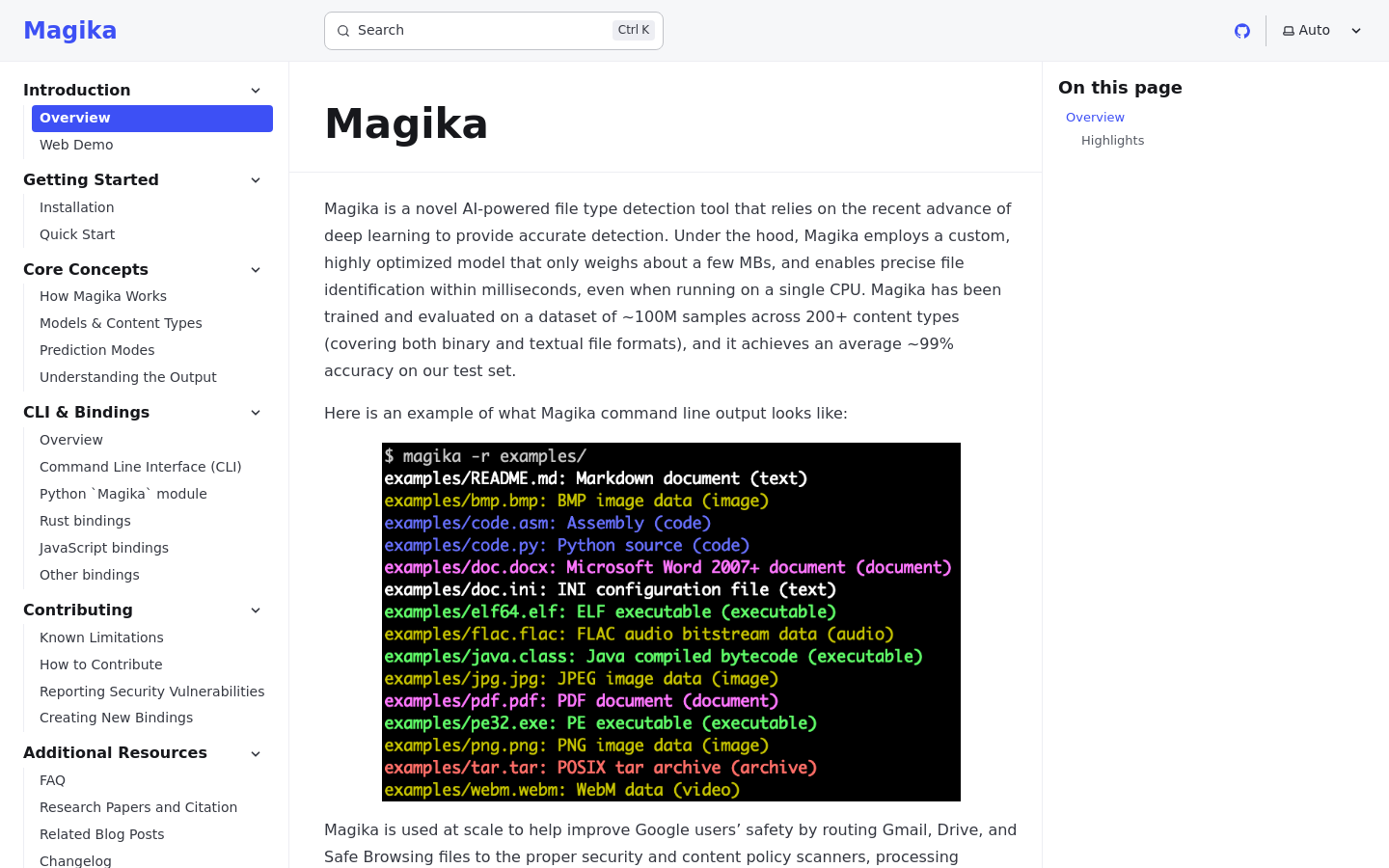 Magika รองรับประเภทไฟล์มากกว่า 100 รูปแบบ ตั้งแต่รูปแบบสื่อทั่วไปไปจนถึงภาษาโปรแกรมที่หายากและโครงสร้างไบนารี โมเดลได้รับการฝึกฝนบนชุดข้อมูลขนาดใหญ่ที่หลากหลาย เพื่อให้มั่นใจว่ายังคงความทนทานต่อการเปลี่ยนแปลงของส่วนหัวไฟล์และเทคนิคการพรางตัวที่มักพบในการวิจัยด้านความปลอดภัย