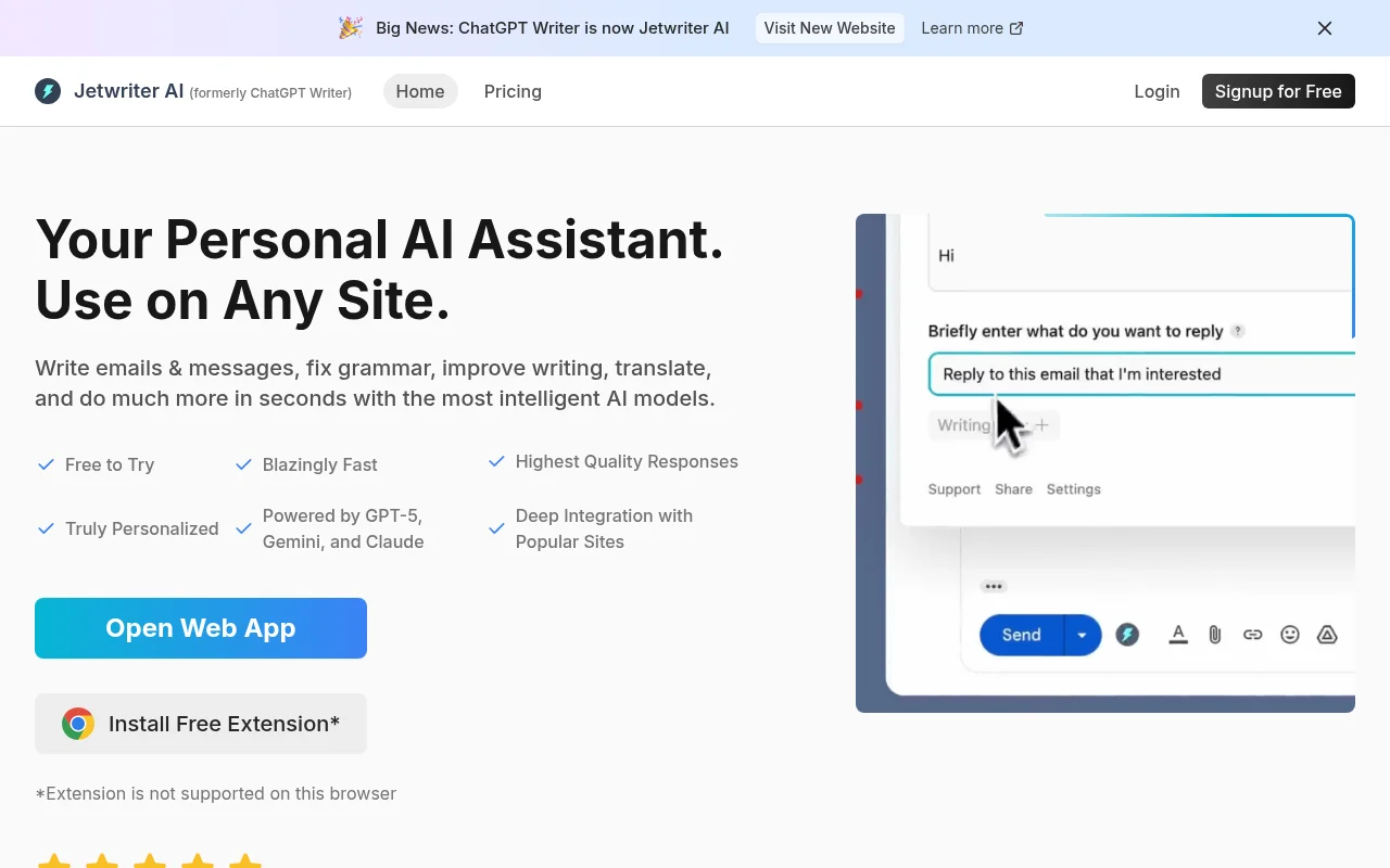 Jetwriter AI คือผู้ช่วยเขียน AI อเนกประสงค์ ออกแบบมาเพื่อปรับปรุงการเขียนบนแพลตฟอร์มต่างๆ รวมถึง Chrome, เดสก์ท็อป และมือถือ ช่วยให้ผู้ใช้สร้าง ปรับปรุง และแปลข้อความได้อย่างง่ายดายภายในเว็บไซต์, ไคลเอนต์อีเมล หรือแอปส่งข้อความใดๆ ต่างจากเครื่องมือเขียนแบบสแตนด์อโลน Jetwriter AI ผสานรวมโดยตรงกับเวิร์กโฟลว์ของคุณ โดยมีคุณสมบัติต่างๆ เช่น การแก้ไขไวยากรณ์ การสรุป และการปรับรูปแบบด้วยการคลิกขวาหรือปุ่มลัดง่ายๆ ขับเคลื่อนโดยโมเดล AI ชั้นนำ เช่น GPT-5, Gemini และ Claude Jetwriter AI มอบการตอบสนองคุณภาพสูงและเป็นส่วนตัว เครื่องมือนี้เหมาะสำหรับมืออาชีพ นักเรียน และทุกคนที่ต้องการปรับปรุงประสิทธิภาพและคุณภาพการเขียน ประหยัดเวลาและเพิ่มประสิทธิภาพการสื่อสารในบริบทต่างๆ