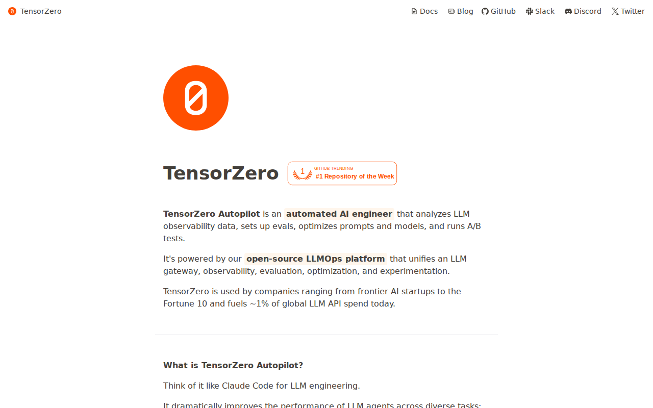 TensorZero เป็นแพลตฟอร์ม LLMOps แบบโอเพนซอร์สที่ออกแบบมาเพื่อปรับปรุงการพัฒนาและการปรับใช้แอปพลิเคชัน LLM โดยมีเกตเวย์ API แบบรวมศูนย์, การสังเกตการณ์ที่ครอบคลุม, เครื่องมือประเมินผลที่แข็งแกร่ง, ความสามารถในการปรับแต่งพรอมต์และโมเดล, และคุณสมบัติการทดลองในตัว เช่น การทดสอบ A/B แตกต่างจากโซลูชันที่กระจัดกระจาย TensorZero มอบสภาพแวดล้อมที่สอดคล้องกันสำหรับการจัดการวงจรชีวิต LLM ทั้งหมด ใช้ประโยชน์จากวิศวกร AI อัตโนมัติ, Autopilot, เพื่อวิเคราะห์ประสิทธิภาพ LLM, ตั้งค่าการประเมินผล, ปรับแต่งพรอมต์, และเรียกใช้การทดสอบ A/B แพลตฟอร์มนี้เหมาะสำหรับสตาร์ทอัพ AI และองค์กรที่ต้องการปรับปรุงประสิทธิภาพ LLM, ลดต้นทุน, และเร่งนวัตกรรม TensorZero ถูกใช้โดยบริษัทต่างๆ ตั้งแต่สตาร์ทอัพ AI แนวหน้าไปจนถึง Fortune 10 และขับเคลื่อน ~1% ของค่าใช้จ่าย API LLM ทั่วโลกในปัจจุบัน