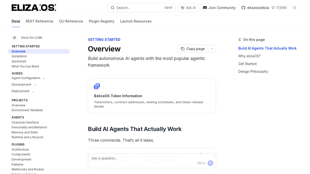 ElizaOS 是一個專為 AI 工具設計的文件平台,由 Mintlify 建立。它提供了一個結構化的環境,用於創建和管理文件,提供版本控制、程式碼片段和互動式範例等功能。與一般的文檔平台不同,ElizaOS 專為 AI 專案的獨特需求量身定制,例如處理複雜的模型架構和 API 整合。它結合了 Markdown 和自定義元件來創建豐富的互動式文檔。這個平台非常適合希望簡化文件流程、改善協作並增強其 AI 工具使用者體驗的 AI 開發人員和團隊。