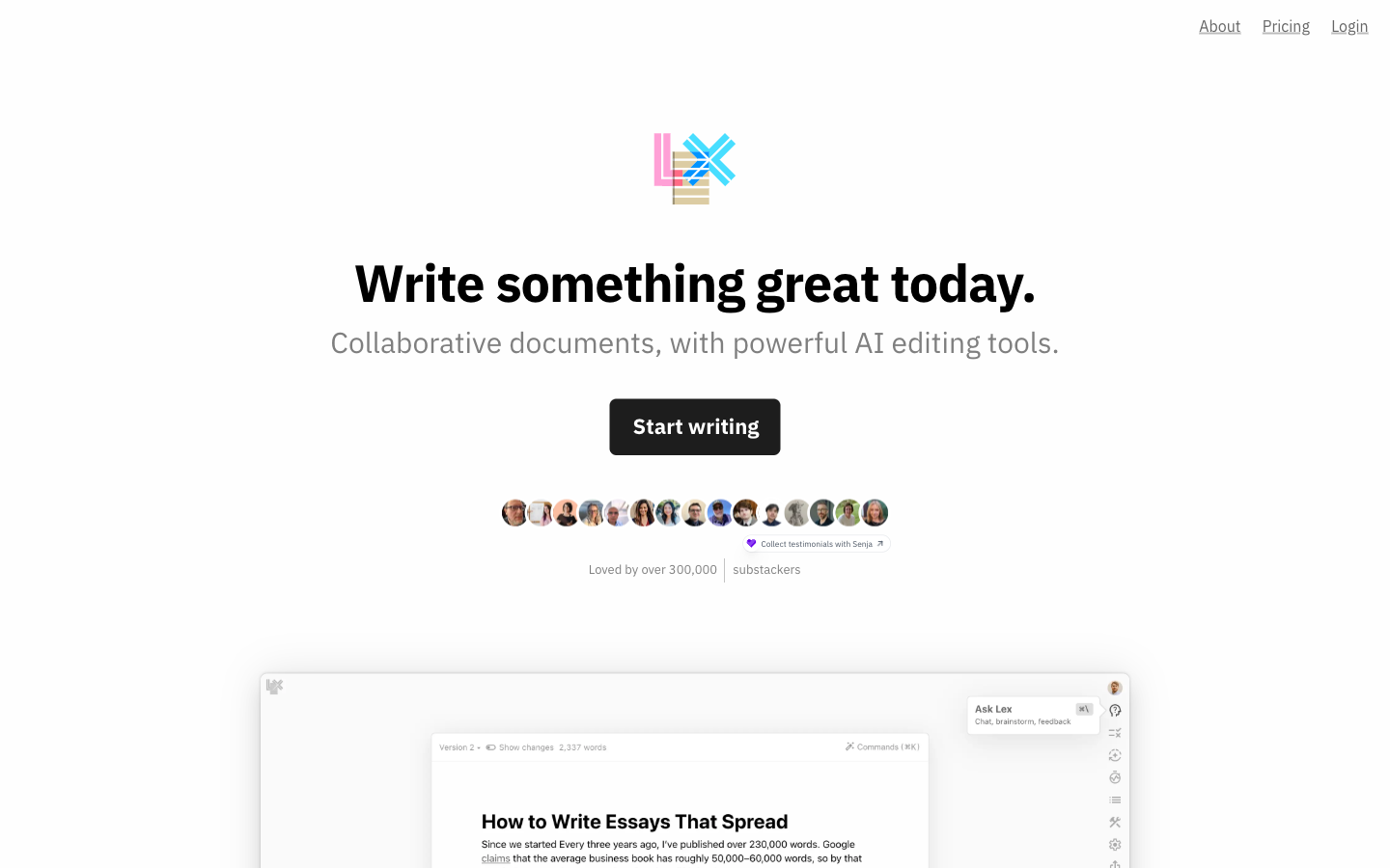 作家和作者受益於 Lex 的 AI 驅動編輯工具和簡潔介面,這有助於他們專注於寫作並提高內容品質。該平台的功能簡化了寫作過程,使其更容易創建和完善草稿。